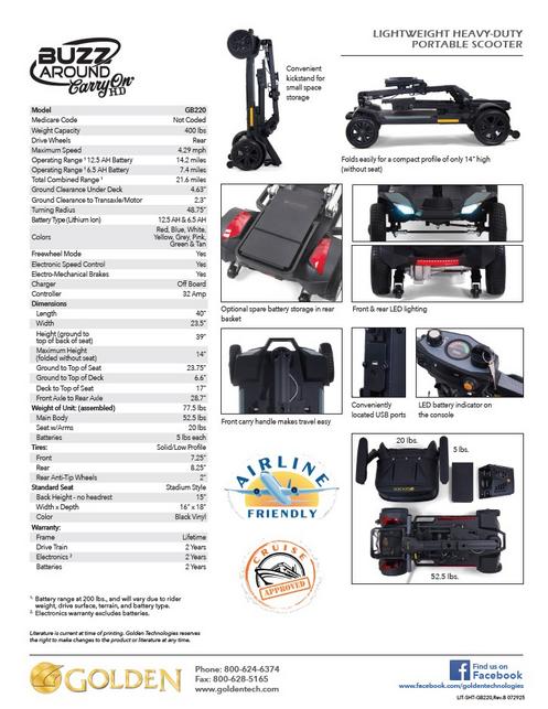 Fold-Flat Scooter is small in stature and big on fun! This super portable, sporty new scooter will take you where you want to go in comfort and style! It features an infinite adjustable tiller, full front and rear light package, lithium ion battery pack (travel battery pack sold separately), and 300 lb. weight capacity. The heaviest piece is 47.5 lbs. (without seat and batteries) and the height when folded is only 12”. It disassembles easily into two pieces and is designed to store in the smallest compartments. Pack your dreams and go anywhere with the CarryOn! (Optional 6.5 AH battery pack can be removed and taken as a carry on while traveling by air, sea or train)