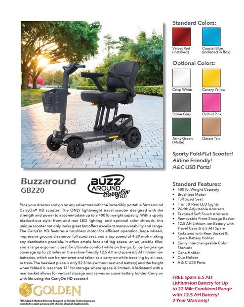 The all-new Buzzaround LT scooter is the smallest, lightest, and most portable Buzzaround scooter to get you were you want to go in comfort and style! Offered in both 3-wheel and 4-wheel models, this sporty design features a lightweight, stadium style seat, a weight capacity of 300 lbs., and increased foot room. The new Buzz LT also has a charger port in the tiller, a new hard plastic rugged basket, and color through shrouds. Enjoy its tight indoor maneuverability and smooth outdoor ride with 2.5" of ground clearance!